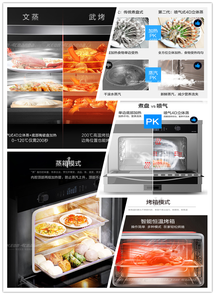 下方搭載的蒸烤消功能,一鍵輕松搞定,通過(guò)“薩萊米”陶瓷加熱盤產(chǎn)生蒸汽,并滲入食物中來(lái)使食物熟透,底部有一個(gè)光滑平整的加熱盤,隱形導(dǎo)流管將外置水箱中的水引流至加熱盤內(nèi),加熱盤不斷升溫,到一定溫度時(shí),盤內(nèi)的水即會(huì)蒸發(fā)成水蒸汽,蒸汽在箱內(nèi)彌漫,滲入食物中,使美食做到外酥里嫩,營(yíng)養(yǎng)不流失。多種蒸烤模式選擇能同時(shí)滿足用戶多樣化的烹飪需求,除此之外還有高溫消毒模式,為廣大用戶飲食健康提供有力保障!