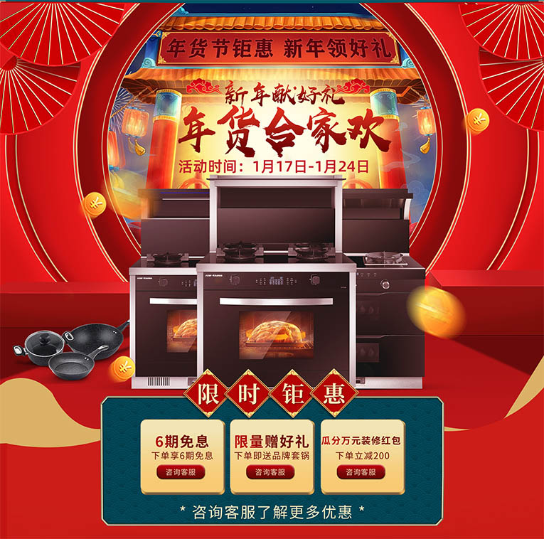 除了“年貨節(jié)”特有活動(dòng)外,集成灶十大品牌、廚電行業(yè)十大品牌科恩官方旗艦店還有更多的驚喜為你呈現(xiàn),跨店滿減、白條免息、瓜分萬元紅包、幸運(yùn)抽獎(jiǎng)等等。具體活動(dòng)請(qǐng)前往京東科恩官方旗艦店了解詳情!