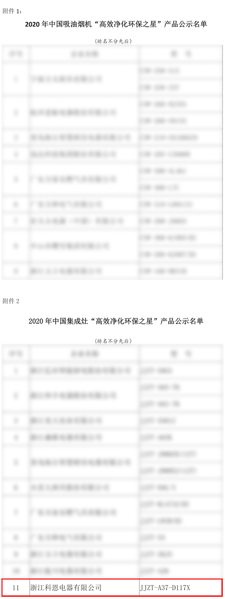 近日,由中國(guó)五金制品協(xié)會(huì)組織2020年度中國(guó)吸油煙機(jī)、集成灶“高效凈化環(huán)保之星”評(píng)比中,科恩智能變頻集成灶D117X憑借較高的油煙吸凈率及油煙分離率榮膺“高效凈化環(huán)保之星”的稱號(hào)!
