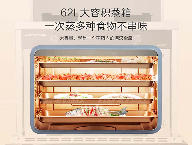 集成灶十大品牌、廚電行業(yè)十大品牌科恩D123X蒸烤消一體集成灶,擁有62L大容積內(nèi)膽,內(nèi)部設(shè)有多層蒸架,選用進(jìn)口“薩萊米”陶瓷加熱盤,噴氣式4D立體蒸,噴氣升溫快,能迅速讓蒸汽達(dá)到腔內(nèi)各個(gè)區(qū)域,從而實(shí)現(xiàn)無冷角均勻加熱,蒸汽快速升騰,縮短了加熱的時(shí)間,鎖住了營養(yǎng),實(shí)現(xiàn)食物的原汁原味,使烹飪更加鮮美!