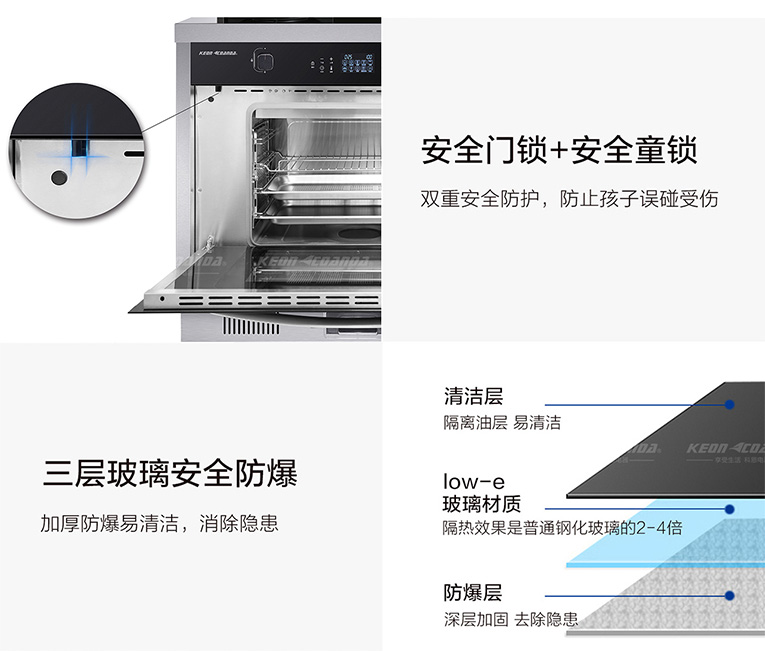 同時(shí)集成灶十大品牌、廚電行業(yè)十大品牌科恩蒸烤消一體集成灶蒸菜時(shí)也不會(huì)出現(xiàn)冷凝水滴落的現(xiàn)象,配備了蒸汽后排技術(shù),蒸汽隨著風(fēng)機(jī)自動(dòng)排出,菜與菜之間不會(huì)串味,這樣出來的菜品也就色香味俱全!另外箱門還有多層高溫防護(hù)技術(shù),在普遍的耐高溫鋼化玻璃基礎(chǔ)上,中間再置入一層Low-e玻璃材質(zhì),隔熱效果是普通鋼化玻璃的2-4倍,避免不小心燙傷皮膚。