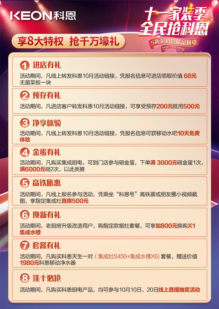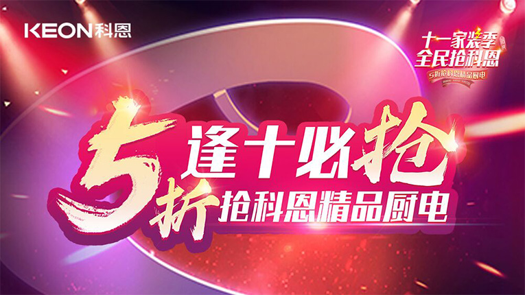 10月1日——10月23日,集成灶十大品牌、廚電行業(yè)十大品牌科恩集成灶“十一家裝季 全民搶科恩”活動開啟,終端活動玩法升級、福利加碼,打造金秋十月盛大福利狂歡盛宴,讓更多人能有機會享受到科恩集成灶十月活動帶來的福利。進店有禮、預(yù)存有禮、凈享體驗、金蛋有禮、高鐵旅惠、換新有禮、套餐有禮、逢十必?fù)尯蓝Y巨獻。