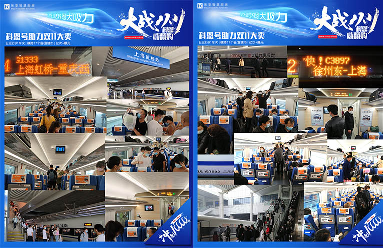 走進(jìn)“科恩號”車廂,從天幕、海報(bào)、電子屏到小桌板,都是來自科恩集成灶的霸屏推送。