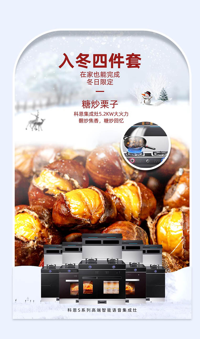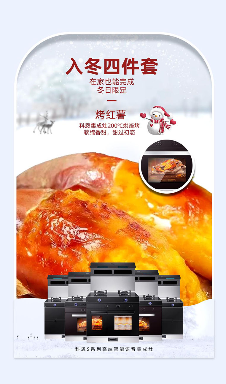 從清晨的朦朧霧氣,到早早降臨的夜幕,偶爾伴著寒氣的風,正在提醒人們天氣已經漸漸轉涼。隨氣溫的驟降,我們開始貪戀熱騰騰的食物,“軟糯的烤紅薯、香甜的糖炒栗子、酸甜的冰糖葫蘆、濃郁的奶茶”,被稱之為“入冬四件套”的話題被沖上了熱搜,來自冬日的儀式感,我們也不能少呀,集成灶十大品牌、廚電行業十大品牌科恩集成灶給你們安排上~