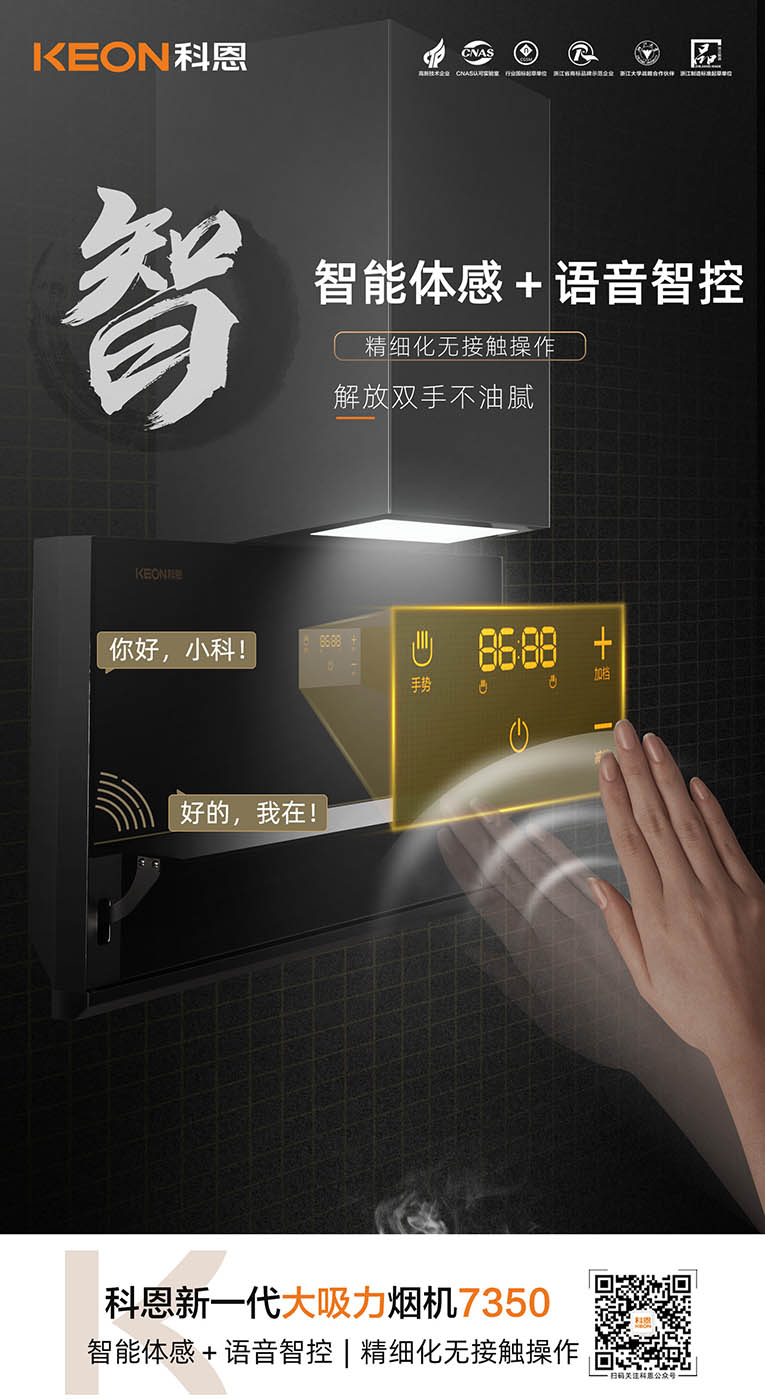 集成灶十大品牌、廚電行業(yè)十大品牌科恩新一代大吸力煙機(jī)7350還擁有智能語音控制與體感操控,呼喚“你好小科”可控制煙機(jī)。