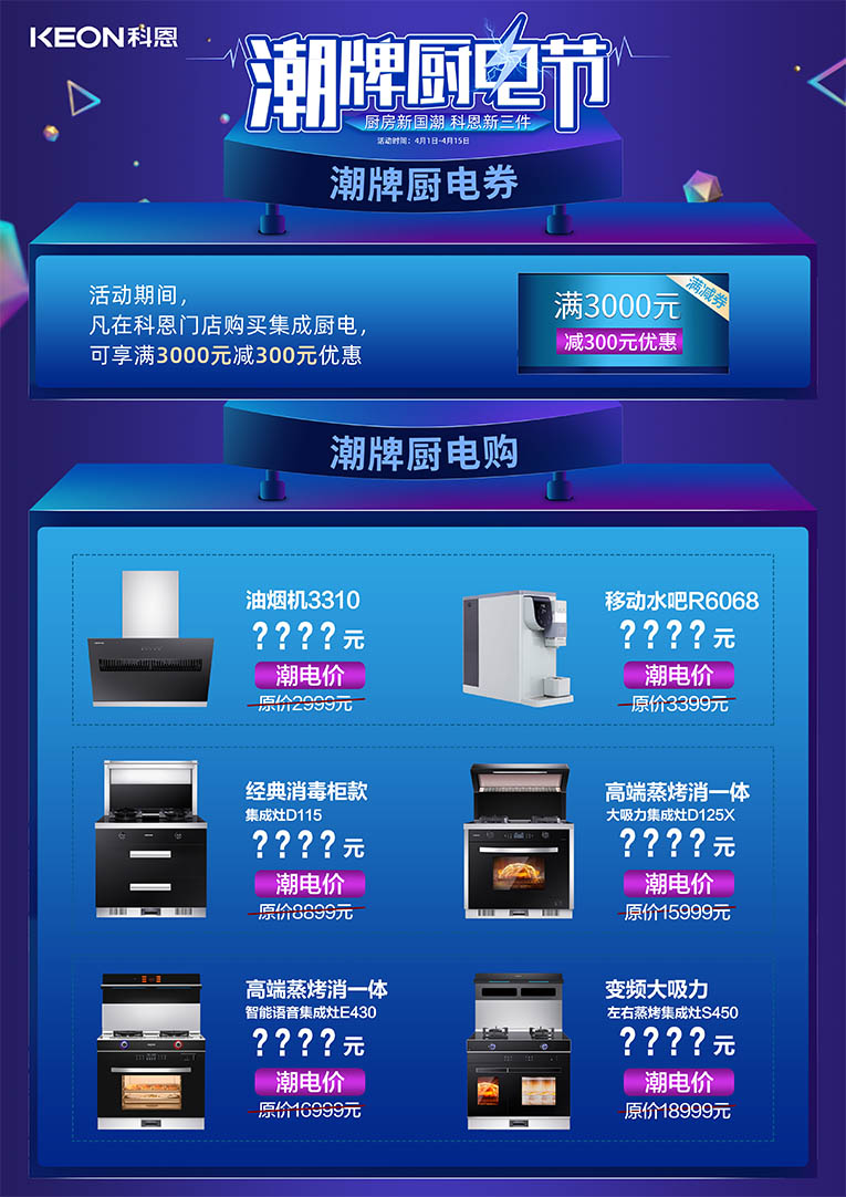 除此之外,更有科恩全國六大戰(zhàn)區(qū)同時(shí)發(fā)力,只為給全國用戶帶來瘋狂特惠?。?月1日——4月15日,進(jìn)科恩門店,潮牌廚電節(jié),更多驚喜等你揭秘~