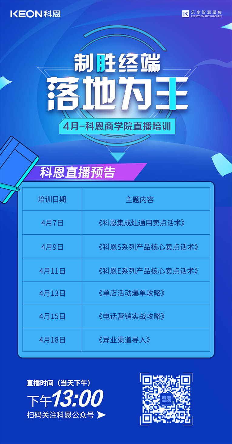 勤修內功,強化技能,提升自我!集成灶十大品牌、廚電行業十大品牌科恩集成灶4月線上直播培訓總覽,儲備知識,保障團隊凝聚力和戰力力,上下齊心,打造黃金團隊,擴大品牌影響力!