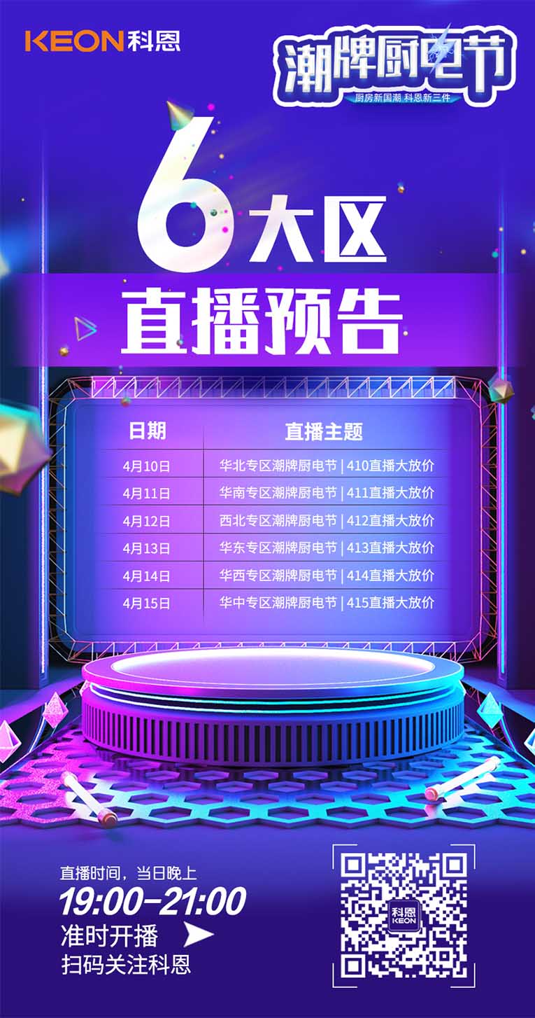 除此之外,為了更好地滿足消費者足不出戶就能選購心儀的集成灶,科恩集成灶#廚房新國潮,科恩新三件#,潮牌廚電節,全國六大戰區同時發力,給予貼心服務!