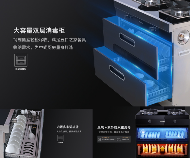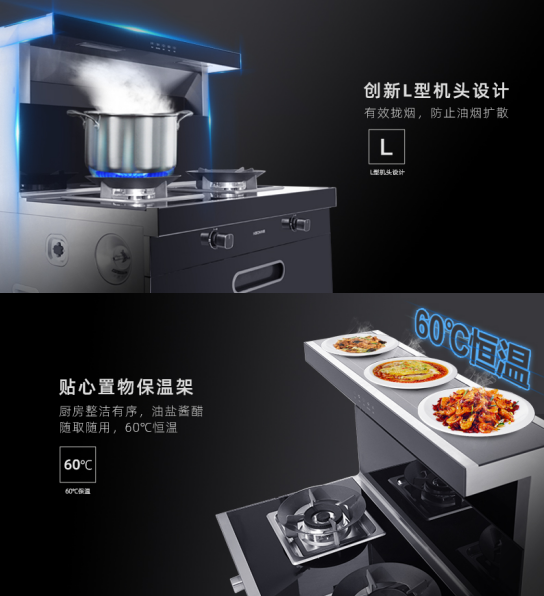 創(chuàng)新L型機頭設計,寬域攏煙,防止油煙擴散,LED節(jié)能照明燈,聚焦視線,沉浸舒適氛圍,60℃恒溫置物臺 ,從此冷菜是路人,廚房整潔有序,油鹽醬醋隨拿隨放。