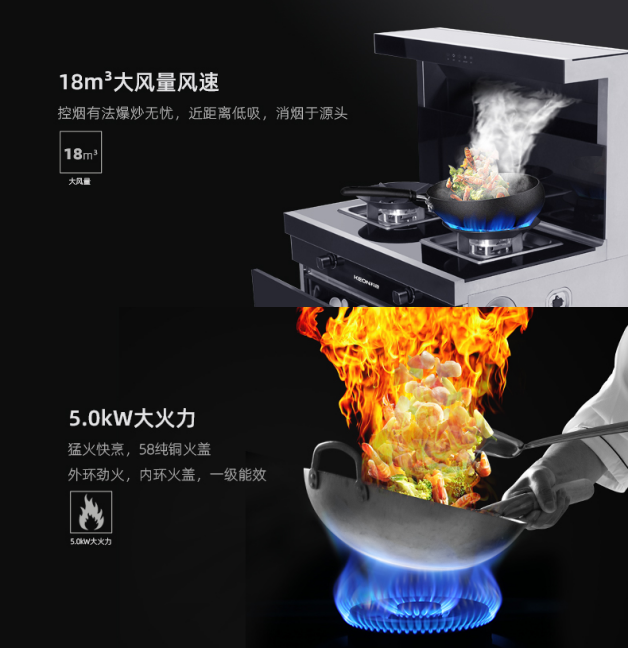 5.0kW大火力,58純銅火蓋,猛火快烹,外環(huán)勁火,一級能效,18m3颶風吸力,低空近吸,控煙有道,爆炒無憂。