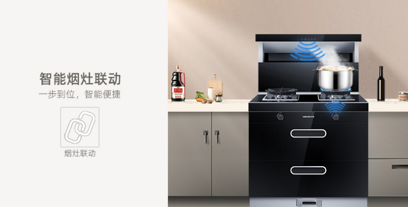 智能煙灶聯(lián)動,煙灶互聯(lián),風隨火動,一步到位,人性化設計,智享烹飪新體驗。