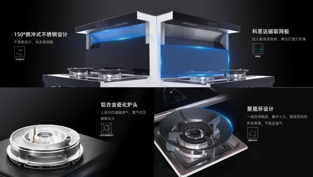 150°俯沖式不銹鋼設計,導流更輕松,排煙更順暢,科恩達磁吸網(wǎng)板,耐用易拆卸,清潔打理360°無死角,鋁合金磁化爐頭+一體拉伸聚能環(huán)設計,受熱更均勻,氧氣更充足,燃燒更充分。