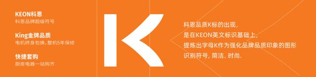 并在KEON英文標(biāo)識(shí)基礎(chǔ)上,提煉品牌超級(jí)符號(hào)“K”,作為強(qiáng)化品牌品質(zhì)印象的識(shí)別符號(hào),也是King金牌品牌(電機(jī)終身包換,整機(jī)5年保修),更是快捷套購(廚房電器一站購齊)。