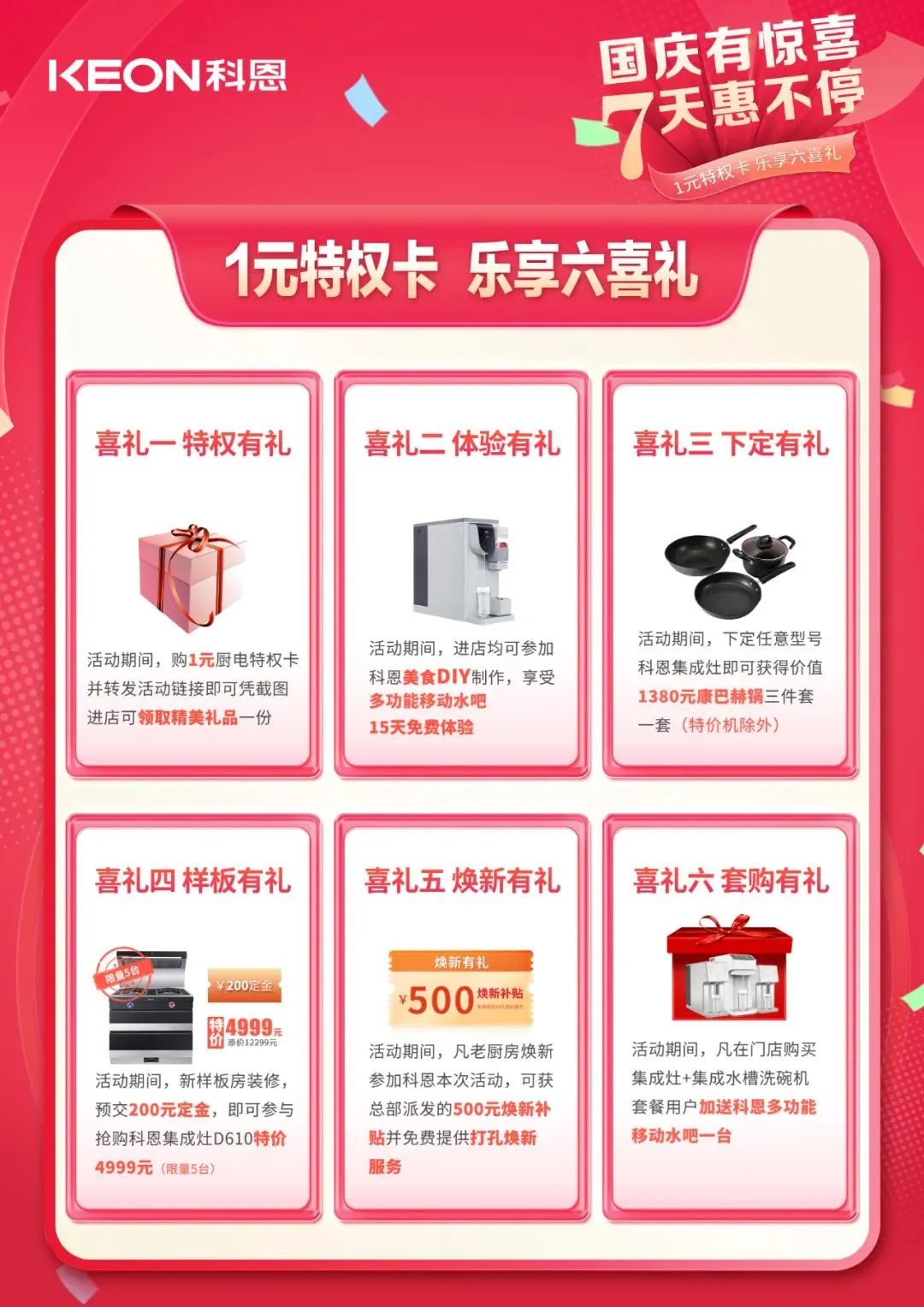 1元瘋搶,給力國慶,科恩家裝廚電節國慶專輯——國慶有驚喜,7天惠不停正火熱進行中,力度空前,更有豪華大禮包驚喜贈送,全民鉅惠,就在科恩家裝廚電節,更多鉅惠活動請詳詢科恩各大門店!