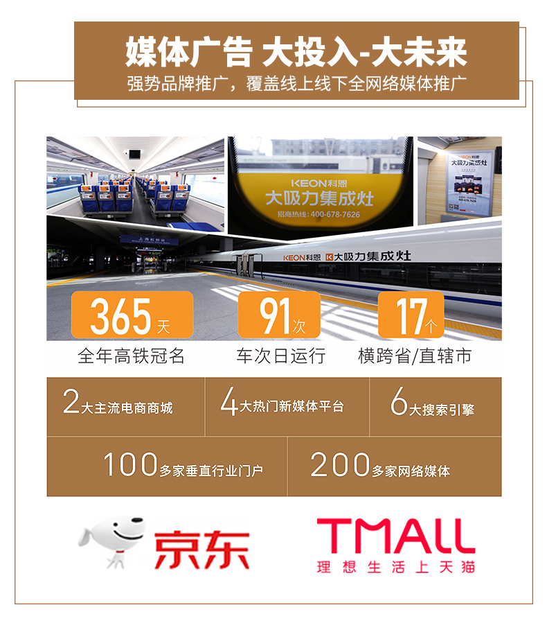 科恩集成灶自2021年以來全力加速品牌推廣進程,大手筆投放高鐵廣告,斥巨資全年冠名——“科恩號”高鐵品牌專列:橫跨17個省/直轄市,日運行91車次,傳播面積之廣,受及群眾之多,在消費者心目中有著極強的影響力和公信力,借助高鐵“國家名片”屬性為品牌權威背書,讓“集成灶就選科恩大吸力”口號傳遍大江南北!如今,科恩電器再次重磅出擊,攜手嵊新高鐵站,強勢霸屏其黃金廣告C位,精準覆蓋,持續(xù)品牌形象建設,為品牌傳播助力加碼,實力詮釋“科恩速度”!