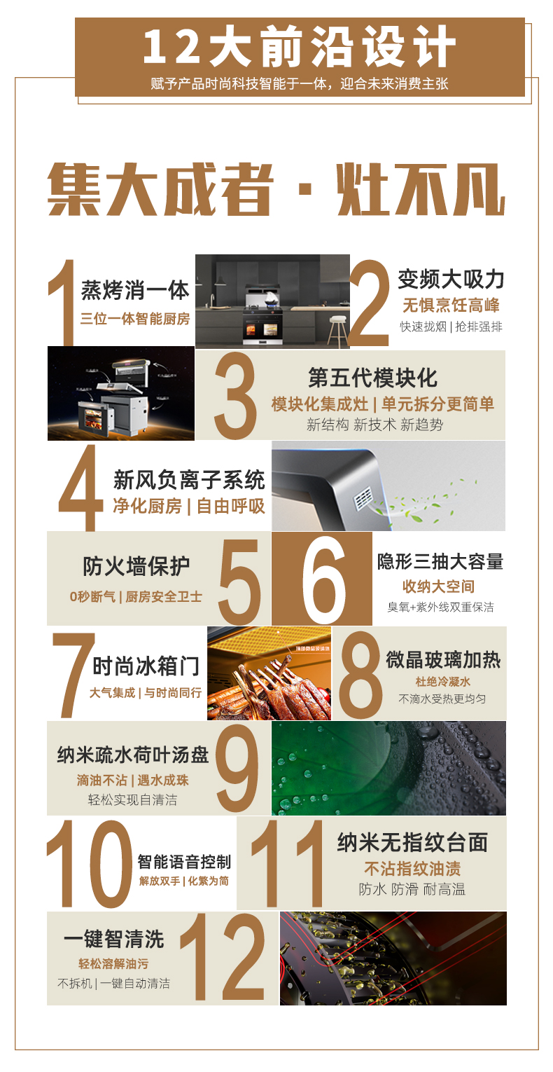 產品好不好,要看用戶的滿意度,科恩集成灶時刻洞察用戶需求變化,在產品研發(fā)上不斷發(fā)力,以變頻大吸力、第五代模塊化、智能語音互聯(lián)、蒸烤消一體、左右蒸烤、微晶玻璃加熱、納米疏水荷葉湯盤、納米無指紋臺面、一鍵智清洗等12大差異化前沿技術,實現(xiàn)多項性能提升突破,為用戶帶去“樂享智慧烹飪”廚房新體驗。