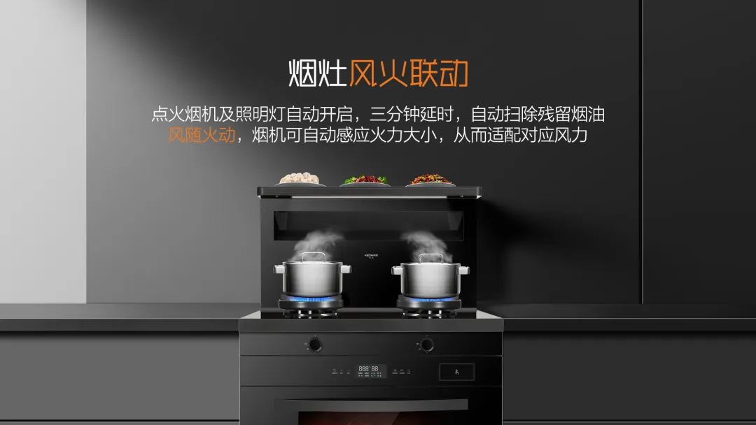 A3系列不僅煙灶聯動,更風隨火動,煙機可自動感應火力大小,從而適配對應風力。