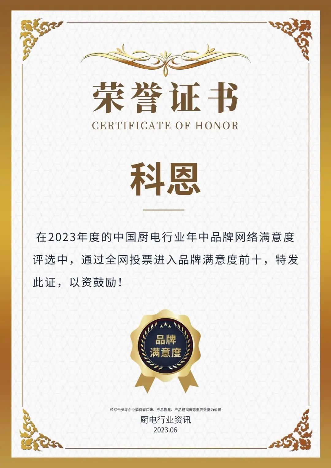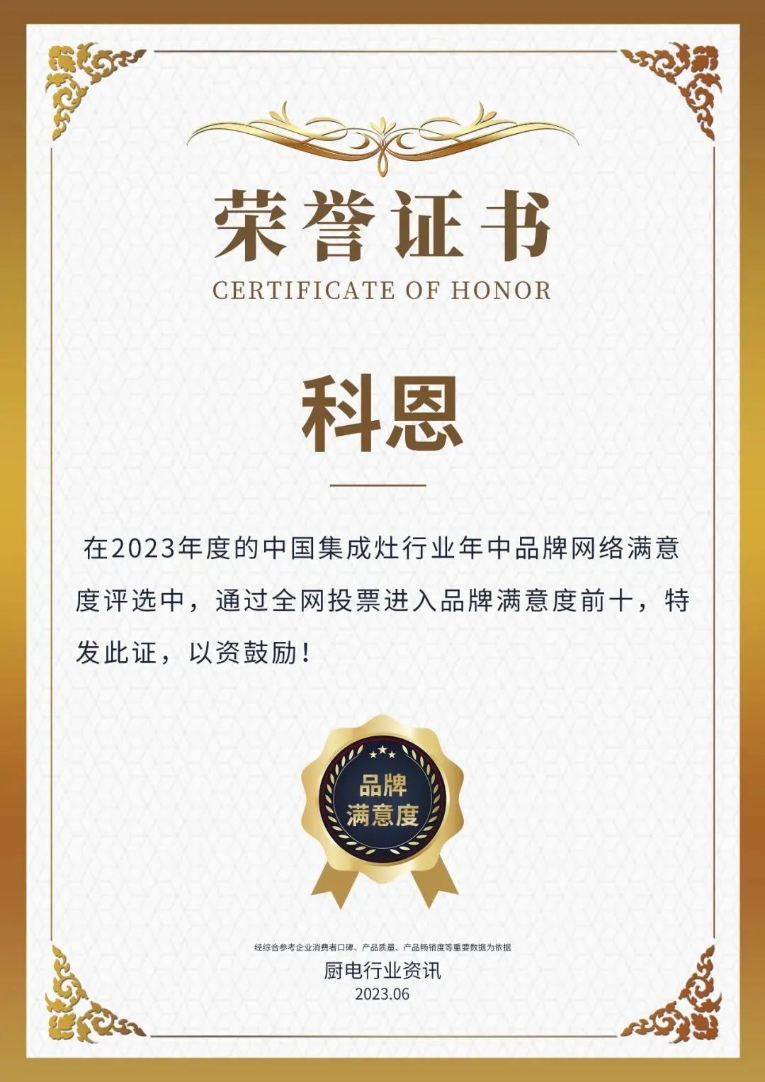 6月16日,浙江科恩電器有限公司再度榮獲“2023年度中國廚電行業品牌年中網絡滿意度前十”、“2023年度中國集成灶行業品牌年中網絡滿意度前十”!