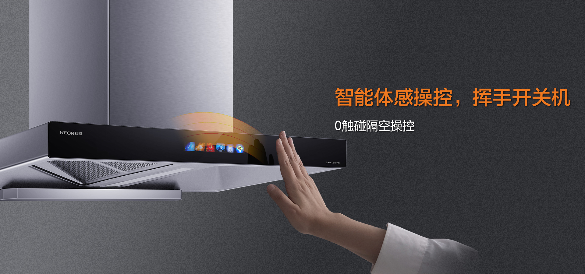 科恩T71油煙機采用超薄頂吸式,可輕松“隱身”,廚房更具美感。