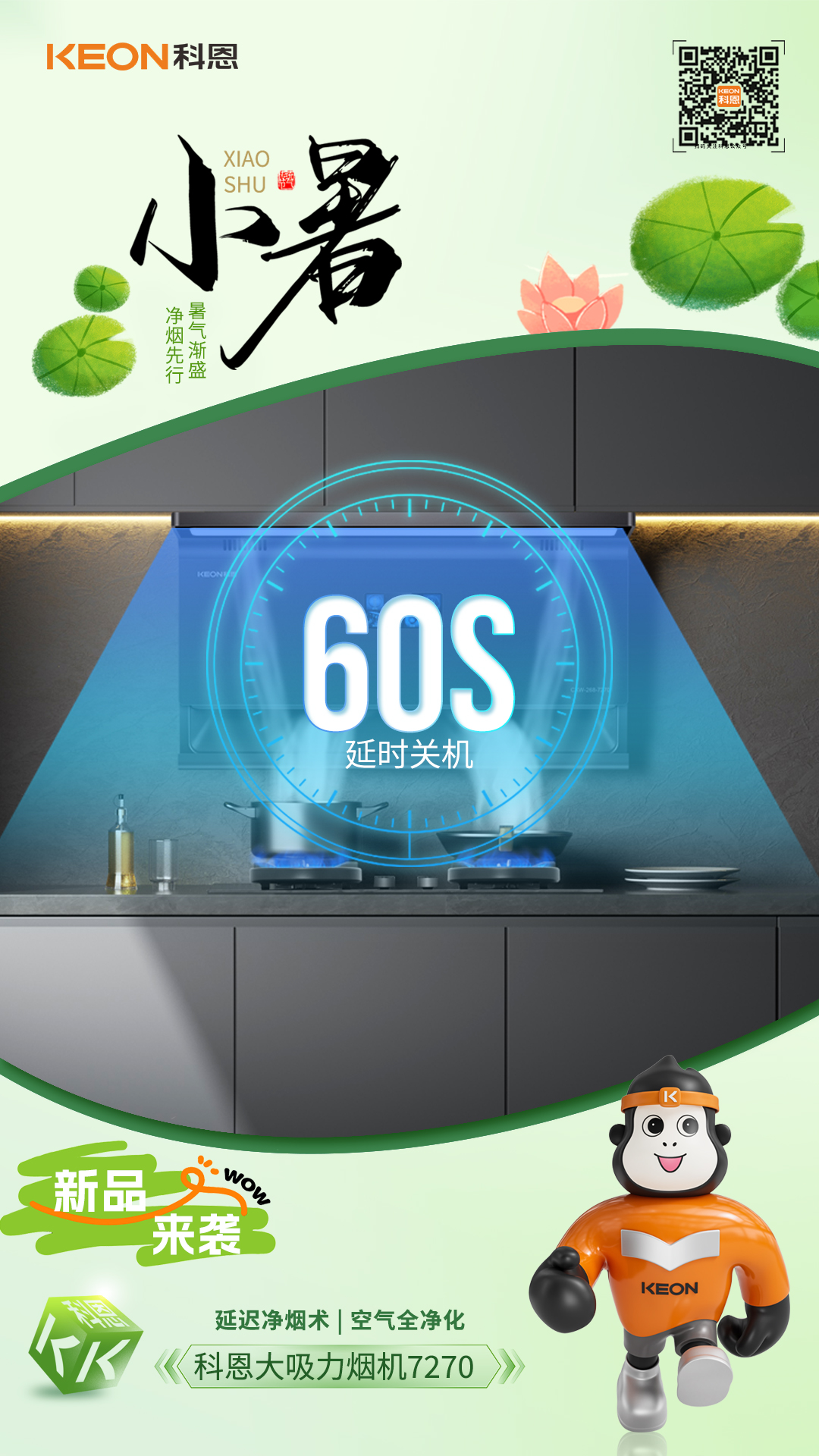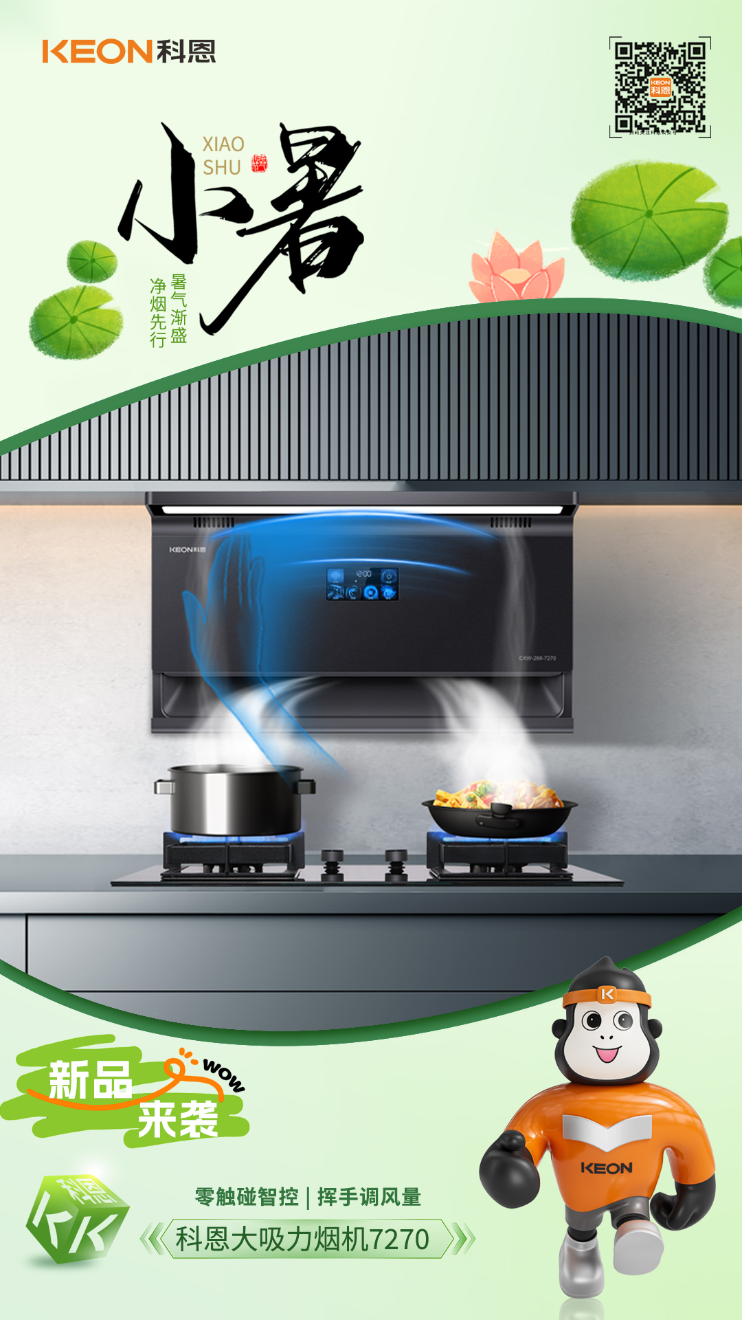 蟬鳴初起,熱浪翻涌。小暑時節(jié)廚房成高溫重災(zāi)區(qū),油煙升騰中包裹著暑氣更顯煩躁,科恩7270煙機攜25m³/min暴風(fēng)吸力來襲,為廚房筑起清涼防線,讓凈煙快一步,生活慢享受。