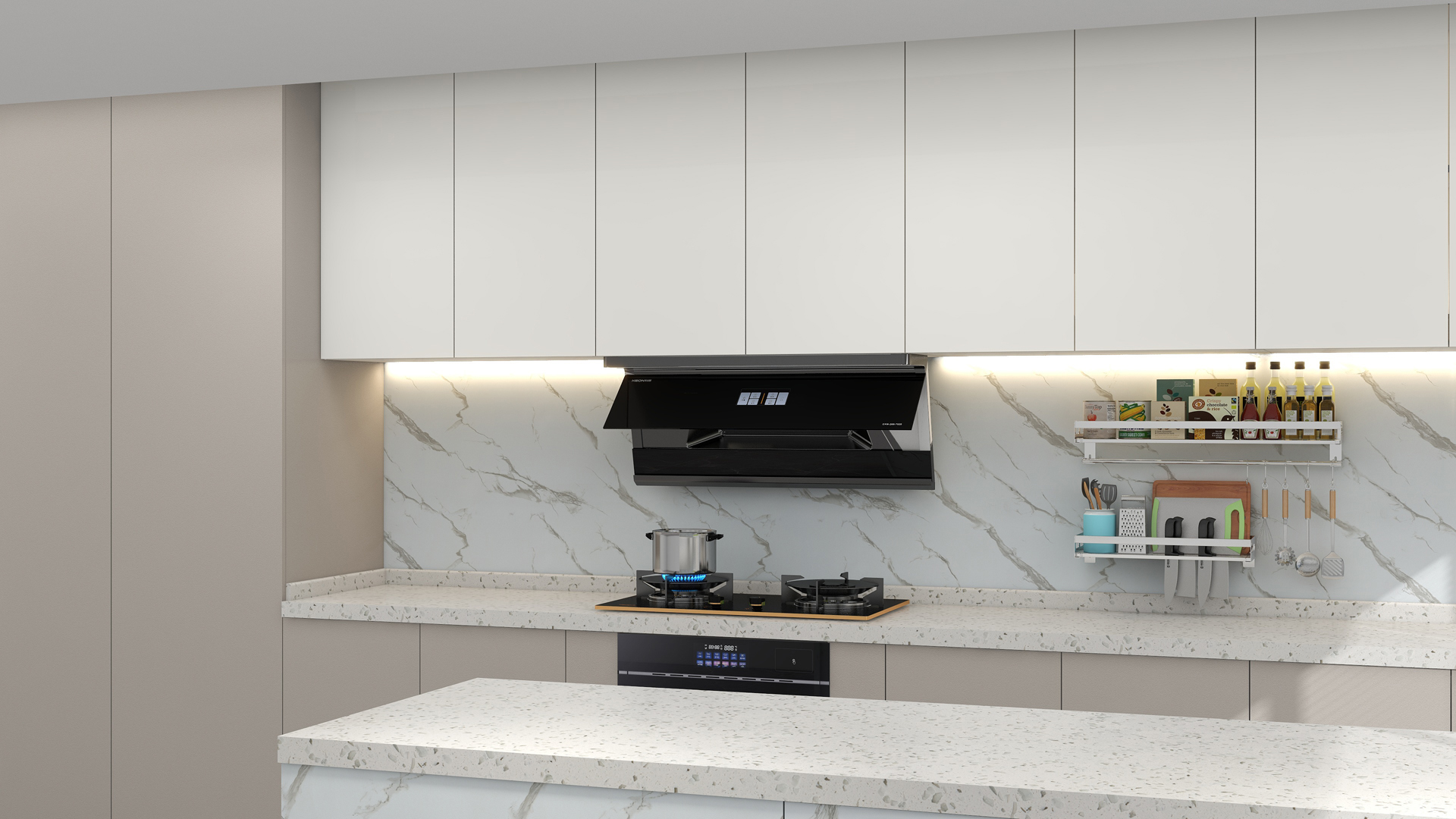 在設配性上,煙機7520突破傳統(tǒng)煙機安裝局限,采用365mm 小圍板結構,能夠完美適配多種尺寸的櫥柜。兼顧美學與實用性,全黑玻璃面板采用一體化成型工藝,不僅視覺上時尚大氣,適配現代簡約、輕奢等多種廚房裝修風格,且表面光滑易清潔,有效降低日常維護難度。操作層面,模塊化觸摸鍵布局清晰,功能標識直觀,搭配揮手智控技術,無需觸碰面板即可完成風量調節(jié)等操作,既便捷又衛(wèi)生,滿足了不同年齡段用戶的使用需求。