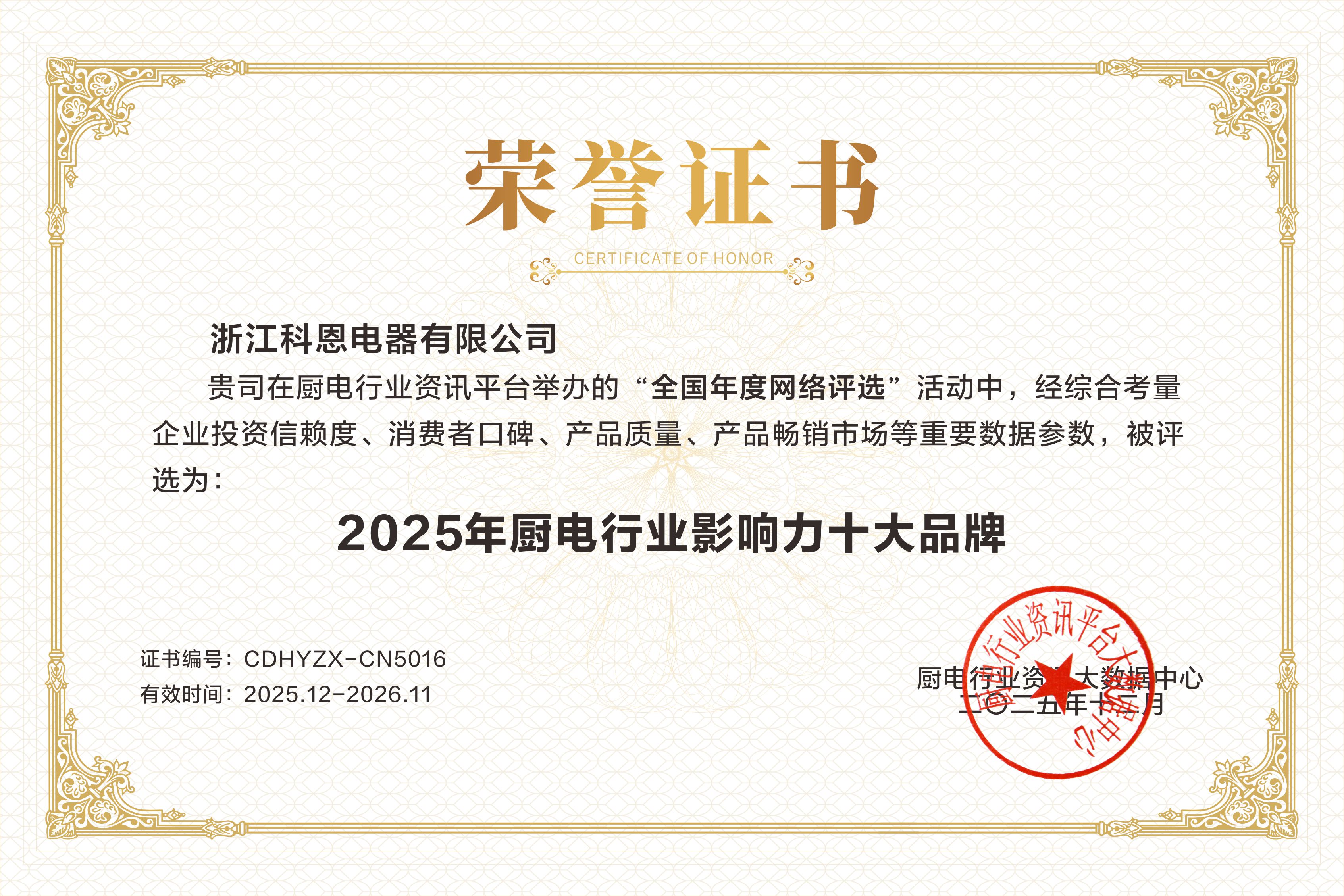 每一次獲獎,都是對過去的總結,更是對未來的承諾。科恩電器感謝每一位用戶的信賴與選擇,感恩行業伙伴的認可與同行。站在新的高度,科恩將承載這份榮耀與期待,繼續秉持匠心與創新精神,不僅致力于提升中國家庭的廚房生活品質,更愿與行業一同成長,共同推動廚電產業邁向更高水平的發展征程。