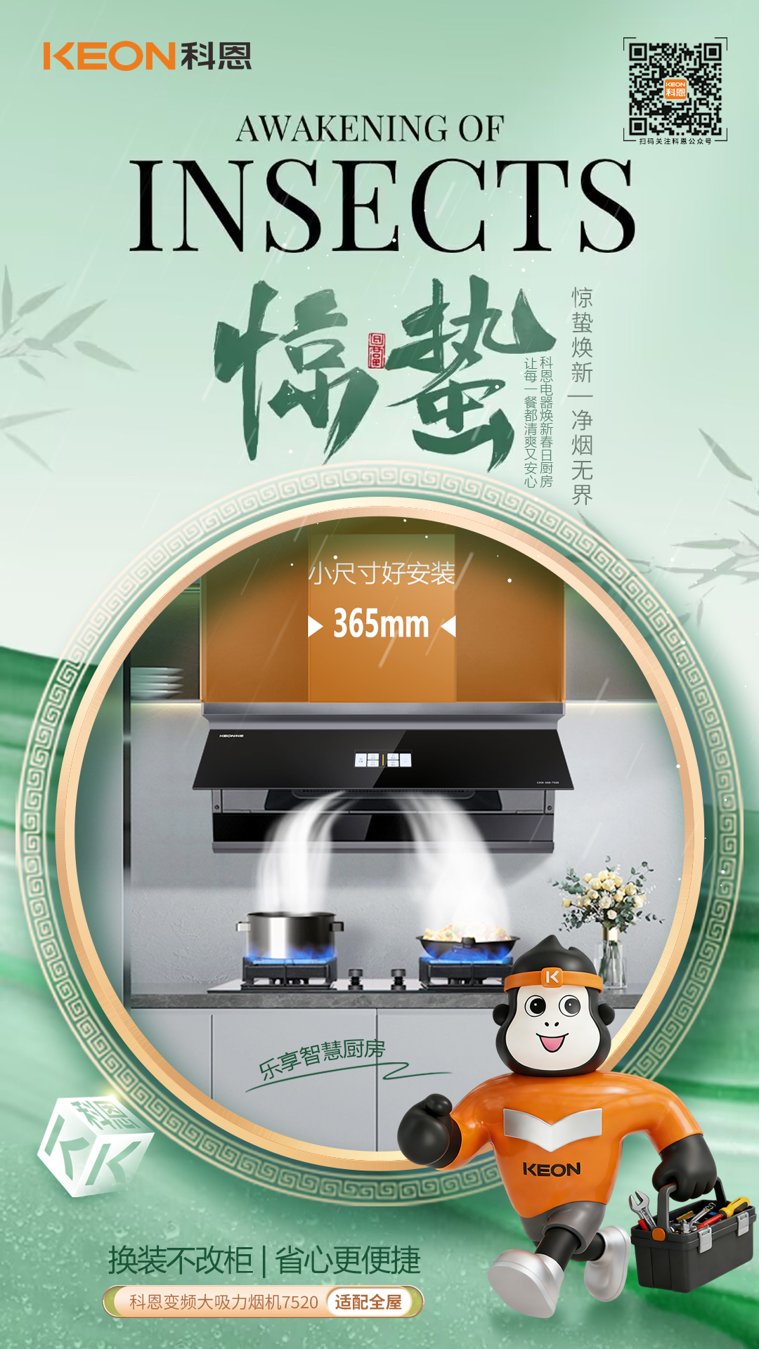 驚蟄啟灶,油煙匿跡。春雷乍響萬物蘇,廚房煥新正當時,舊機乏力煙彌漫,烹飪興致打折扣,科恩煙機7520登場,以巧裝強吸破局,櫥柜零改煥新顏,油煙速凈享清新。巧裝適配,省心煥新。驚蟄換廚不用愁,小圍設計解煩憂,365mm纖薄圍板,多柜適配無壓力,免拆櫥柜直接裝,老房煥新省工時無需大動干戈改,新機即刻入廚房。颶風強吸,煙消無形春雷伴炒煙火起,強吸速排不等待,28m³/min颶風吸力,爆炒油煙瞬間凈,1060Pa高風壓值,煙道擁堵輕松破烹飪高峰排煙暢,廚房空氣常清新。