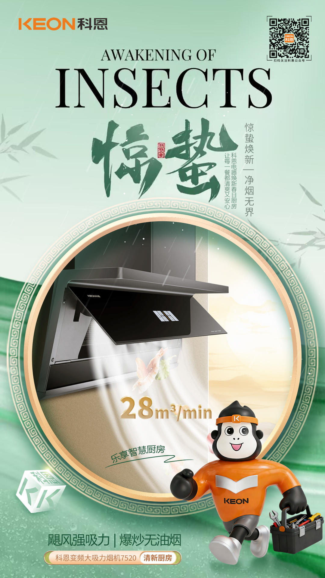 春雷啟驚蟄,煥廚正當時,科恩大吸力煙機7520,以巧裝破局,以強吸凈味,以智能省心一灶春風,一室清新,讓廚房告別油煙困擾,讓烹飪回歸自在從容。驚蟄煥新,選科恩7520,凈享健康無煙,悅啟春日美好廚居生活!