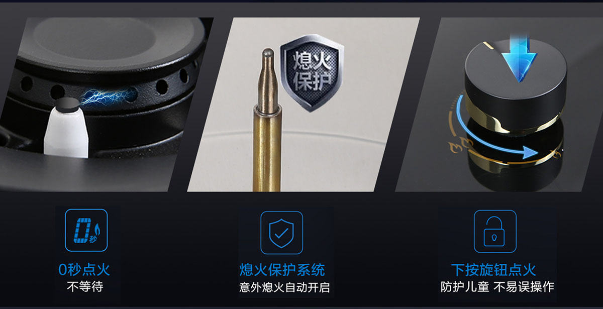 • 自帶童鎖按壓式點火旋鈕點火裝置,有效避免兒童意外開啟