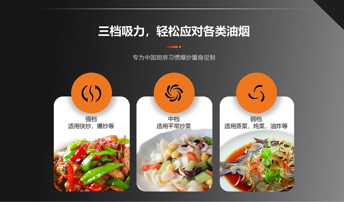 - 三檔吸力,輕松應(yīng)對各類油煙,專為中國廚房習(xí)慣爆炒量身定制