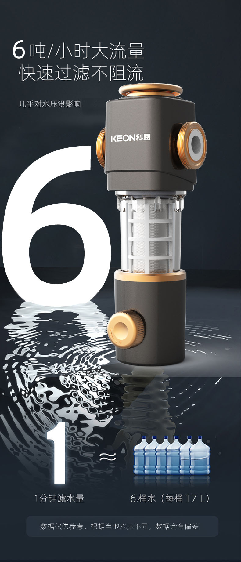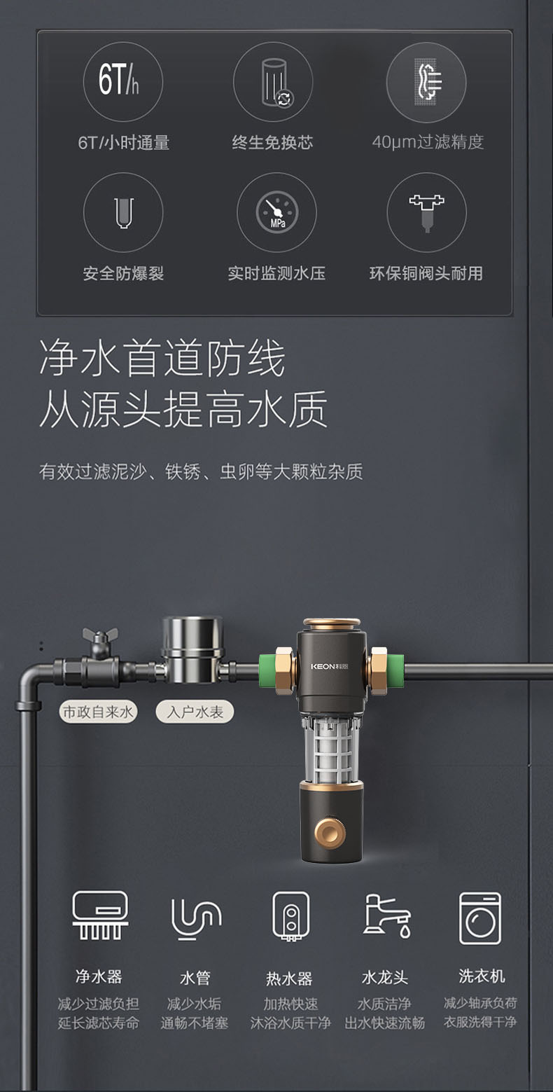 - 6噸/小時大流量,快速過濾,全屋用水無壓力