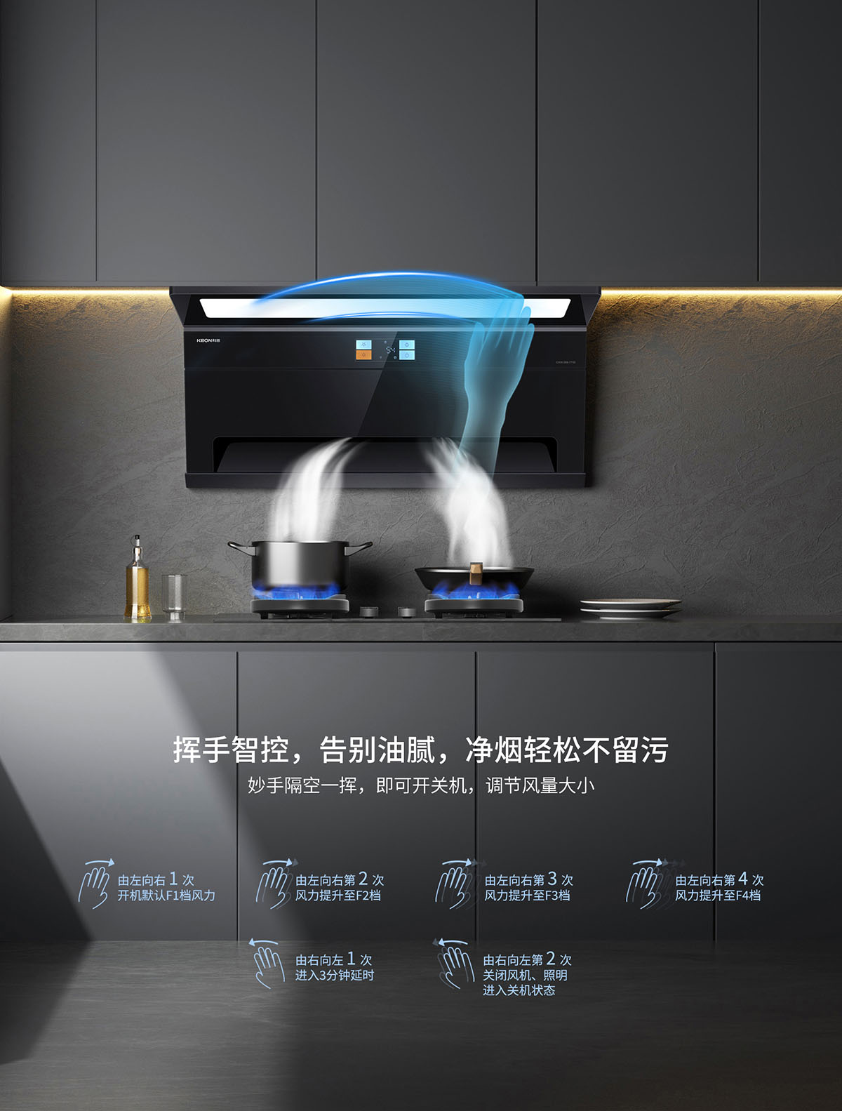 - 體感智控,揮手告別油煙,杜絕操作油膩