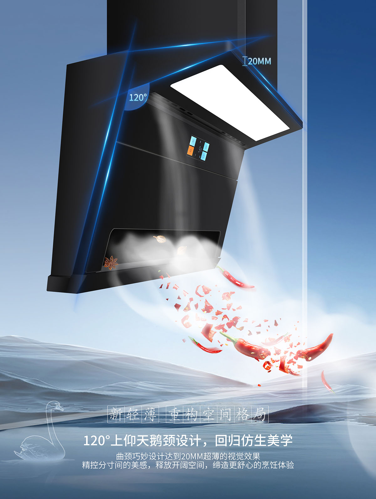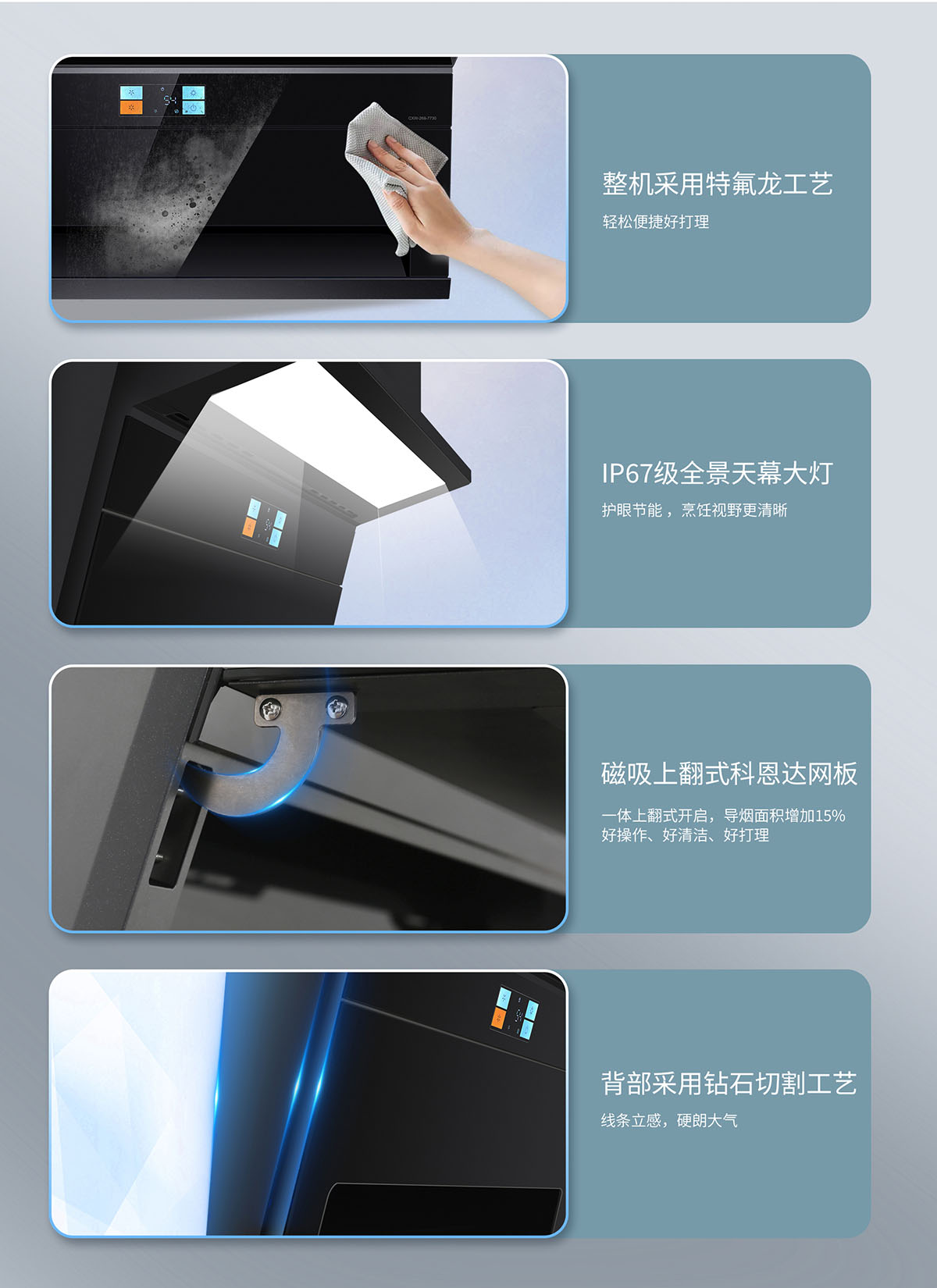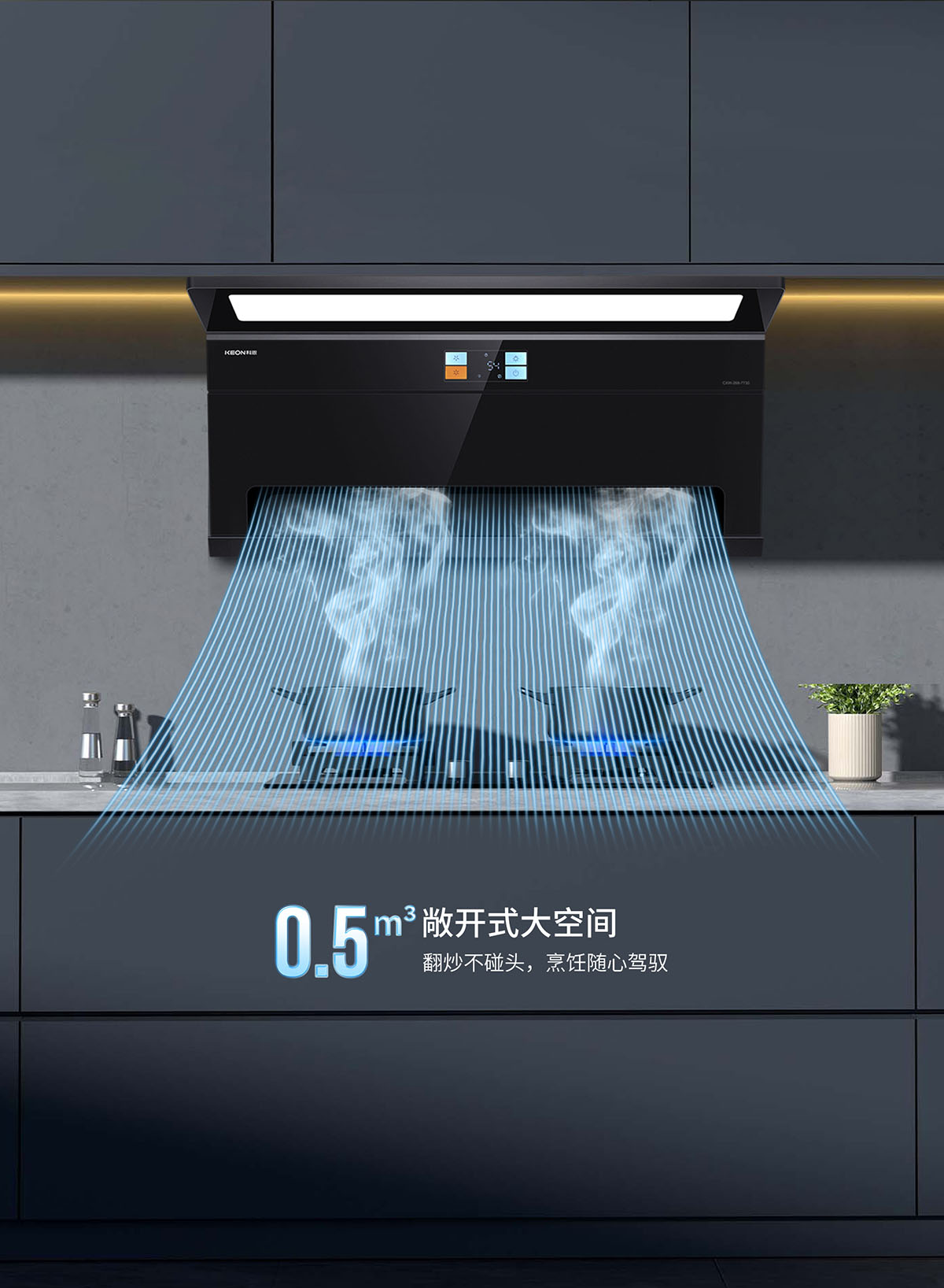 - 磁吸上翻式科恩達導煙板,減震防撞,清潔更便捷